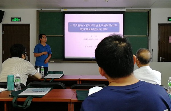 周恺副教授做了“一类具有输入项和标准发生率的时滞SIR模型行波解”的报告,主要介绍了时滞反应扩散系统行波解问题的背景,特别是新近在传染病模型中的研究,讨论了一类具有输入项和标准发生率的时滞SIR传染病模型,给出了行波解和最小波速的存在性,得到了与会专家的认可。(撰稿:周恺/审稿:马小琴)