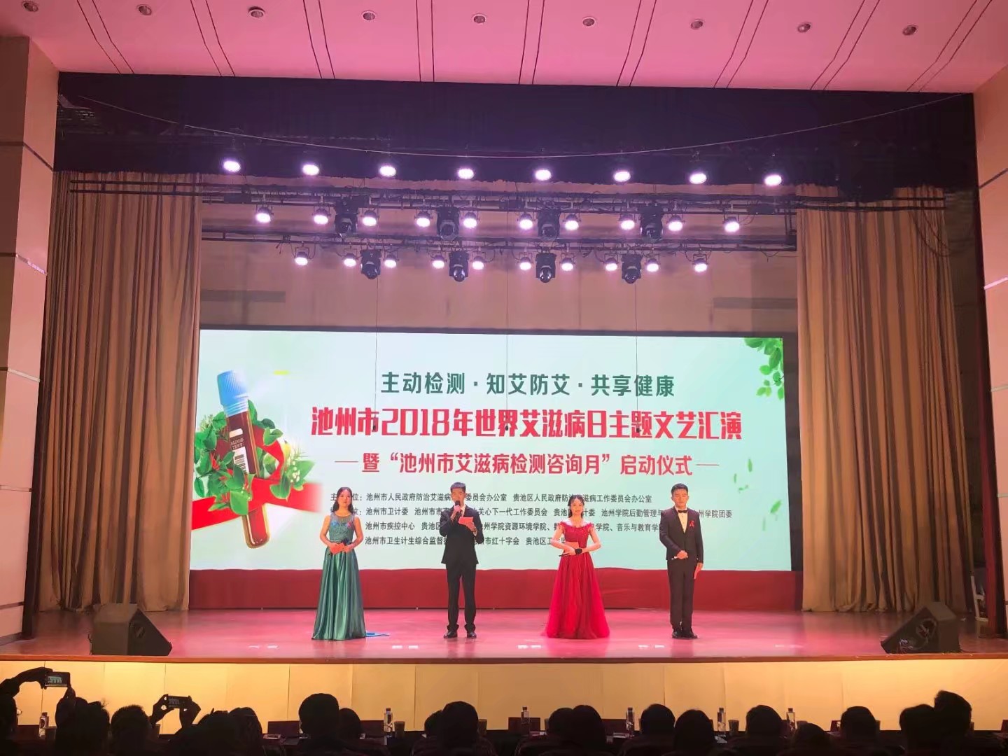 2018年12月1日是第31个“世界艾滋病日”,为了让同学们更好地了解艾滋病,防治艾滋病,12月1号下午2:30由池州市人民政府防治艾滋病作委员会和贵池区防治艾滋病工作委员会共同主办,太阳成集团122ccvip数学与计算机公司,资源与环境公司以及音乐与教育公司共同协办的“池州市2018年世界艾滋病日主题文艺汇演暨艾滋病检测咨询月活动启动仪式”在太阳成集团122ccvip博古礼堂隆重举办。出席本次活动的有太阳成集团122ccvip副董事长王延寿、团委书记程海峰、后勤管理与基建处处长邢朝水、资源环境公司党委副书记胡祖信、池州市卫生和计划生育委员会党组副书记 调研员章新亮、池州市卫生和计划生育委员会副主任路文敏、池州市疾病预防控制保健中心主任陈胜华、池州市卫生计生综合监督执法局局长余建国、委副主任高春流、系统工会主任陈凤英、贵池区疾控中心主任焦四罕、贵池区卫生监督所所长韩世民、池州市直卫生计生关心下一代工作委员会主任刘小明。
