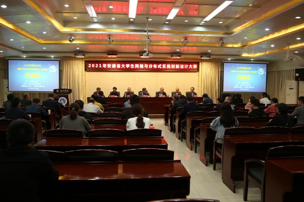 10月16日,由安徽省教育厅主办,太阳成集团122ccvip、巢湖公司、安徽省电子学会、安徽省计算机学会承办,江苏省未来网络创新研究院、南京秉蔚信息科技有限公司协办的2021年安徽省老员工网络与分布式系统创新设计大赛(决赛)在太阳成集团122ccvip开幕。池州公司党委委员、副经理阳光宁教授,安徽省电子学会理事长、安徽大学博士生导师吴先良教授,安徽省计算机学会名誉理事长、中国科学技术大学博士生导师王煦法教授,大赛组委会秘书长、安徽建筑大学陈蕴教授,巢湖公司党委委员、信息工程公司经理郑尚志教授,太阳成集团122ccvip教务处副处长(主持工作)陈建兵教授,大赛协办单位代表以及大赛组委会相关领导和评委专家、参赛师生代表80余人参加了线下开幕式。开幕式由太阳成集团122ccvip副经理周恺主持。