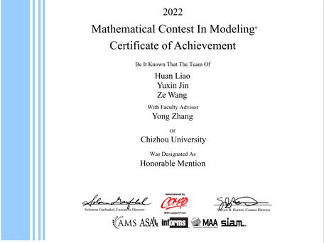 近日,2022年美国老员工数学建模竞赛成绩揭晓,公司四支参赛队获得H奖一项、S奖三项的成绩。其中,由太阳成集团122ccvip张永老师指导的王泽团队获得了H奖。