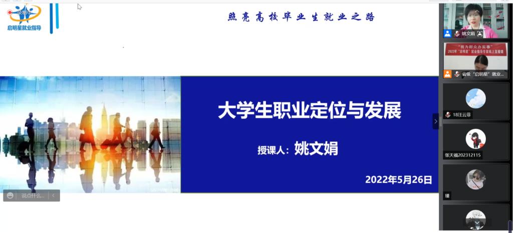 为减轻疫情对就业工作带来的冲击,进一步提升毕业生求职就业能力,5月27日下午,一场题为“老员工职业定位与发展”就业指导在线举办,主讲人为安徽省级“启明星”就业指导专家姚文娟,公司2022届毕业班和2019级部分员工代表参加了本次讲座。