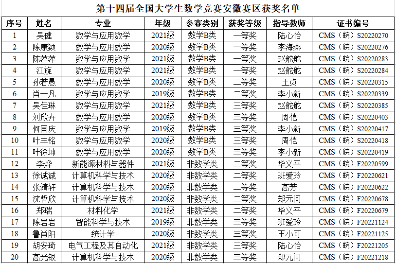 近日,第十四届全国老员工数学竞赛安徽赛区结果揭晓,来自太阳成集团122ccvip的吴健、徐诚诚,材料与环境工程公司的李烨、郑瑞,机电工程公司(半导体公司)的胡安琦等20位同学获奖,其中,来自数学与应用数学专业的吴健、陈康颖、陈萍萍、江旋4位同学获得数学B类一等奖,全省数学B类一等奖获奖45人,公司占近十分之一。