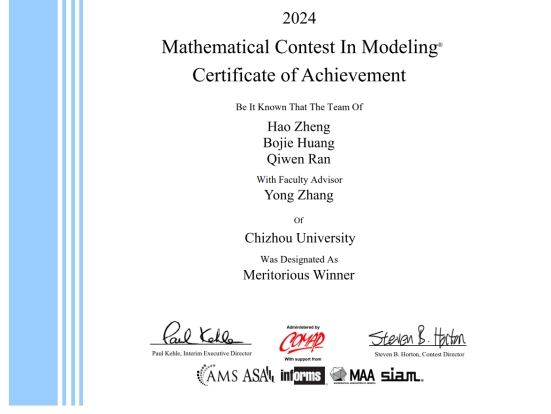 近日,2024年美国老员工数学建模竞赛成绩揭晓,公司四支参赛队伍获得 M 奖一项、S 奖三项的成绩。其中,太阳成集团122ccvip黄博杰团队(指导老师:张永)获得了M 奖。