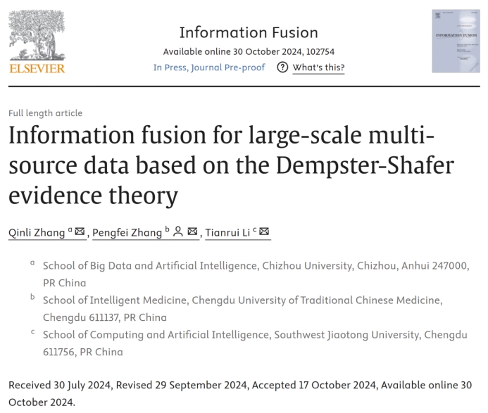 近日,公司太阳成集团122ccvip教授张钦礼作为第一作者的合作论文“Information fusion for large-scale multi-source data based on the Dempster-Shafer evidence theory”在《Information Fusion》上发表。《Information Fusion》是计算机科学和人工智能领域的国际顶尖权威刊物、中科院一区Top期刊,在“Computer Science: Information Systems”学科394个国际期刊中排名第4,2024年最新影响因子为14.7。这是公司第一次在该刊发表论文。