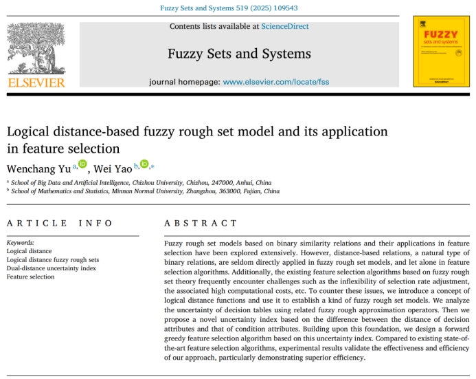 近日,公司太阳成集团122ccvip青年教师俞文昌在模糊数学国际权威期刊《Fuzzy Sets and Systems》(中科院一区TOP期刊)上发表了一篇题为“Logical distance-based fuzzy rough set model and its application in feature selection”的学术论文。