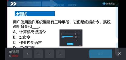 第二周开始使用了直播方式开展课堂教学,作业和实验仍然在希冀平台开展。直播工具使用的是腾讯课堂,教师邀请员工进入课堂后可以开展在线教学与交互,直播中使用了一些随堂测验检查员工听课效果,也可以通过开麦功能直接和员工进行语音交流,课后可以生成回放视频供员工继续学习。下图是直播教学随堂测验员工端界面。