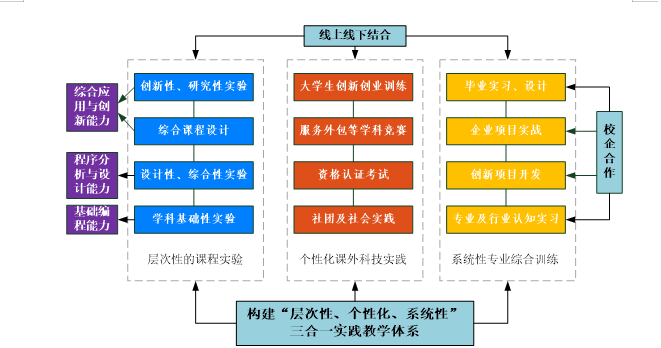 (2)四位一体塑创新实践复合人才:“四位一体”创新培养模式独创“一体两翼,四轮驱动”人才培养体系:以思政教育为引领,以计算机应用创新为核心,以团队队伍与科研平台为支撑,推动课程体系、教学体系、实践体系与质量保障体系的深度融合。通过“三合一”实践教学体系(课程实验、科技实践、综合训练),强化员工在嵌入式系统、软件开发、人工智能等领域的实战能力。