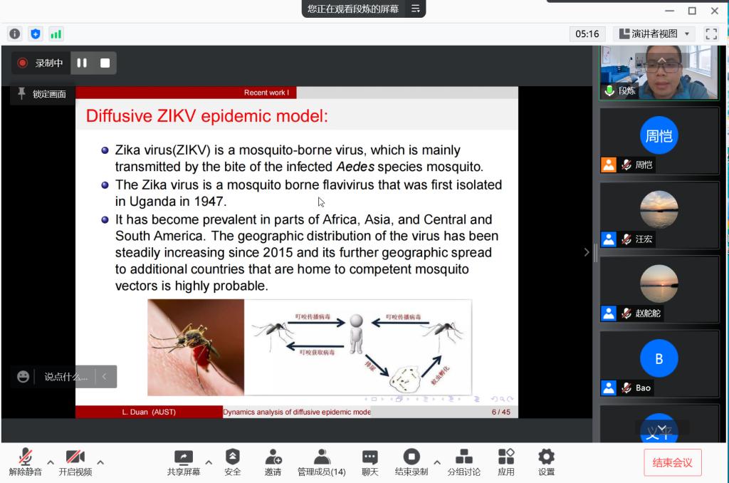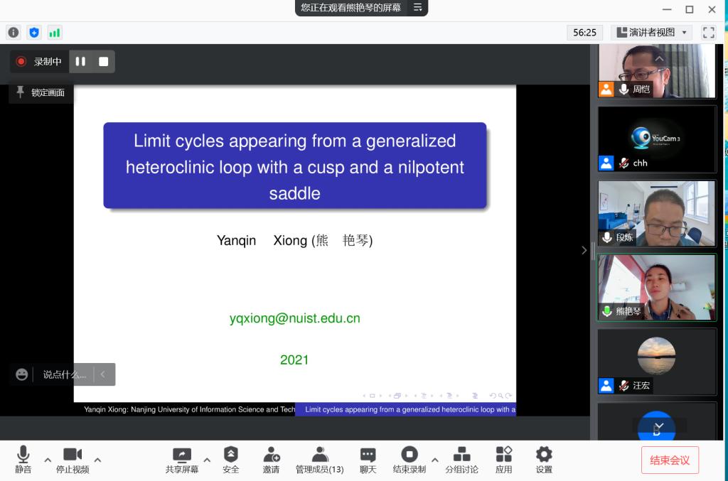 2021年11月19日下午14:30-16:30,安徽理工大学段炼副教授、南京信息工程大学熊艳琴副教授应公司邀请在腾讯会议(ID:732914951)分别作了题为“Dynamics analysis of some diffusive epidemic models with spatial heterogeneity”、“Limit cycles appearing from a generalized heteroclinic loop with a cusp and a nilpotent saddle”的学术报告。公司部分教师和部分员工代表聆听了此次精彩的报告。