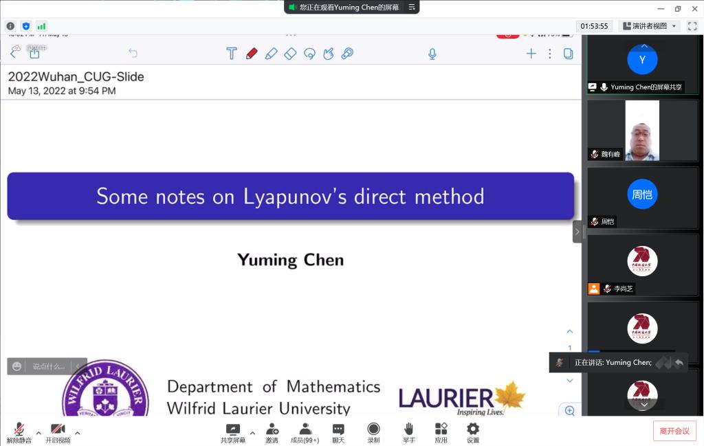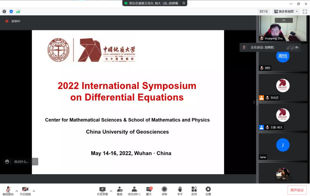 5月14-15日,“微分方程国际会议”通过腾讯会议线上举行,此次研讨会是中国地质大学(武汉)70周年校庆的系列学术活动之一,以更好地交流微分方程理论及相关领域的最新研究成果和学术发展动态为主旨,为国内外同行专家之间的学术交流与合作提供平台。开幕式由中国地质大学(武汉)数学与物理公司经理郭上江教授主持,太阳成集团122ccvip周恺、赵舵舵两位教师应邀参会。