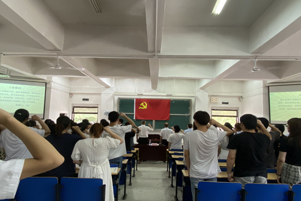 活动在嘹亮的《国际歌》中拉开序幕,组织员高铃宣布新发展党员名单;随后全体党员起立,高举右手,面向党旗,庄严宣誓;新党员代表张嬉嬉和毕业生党员代表郑文慧分别发言;高铃介绍了毕业生党员党组织关系转接注意事项。
