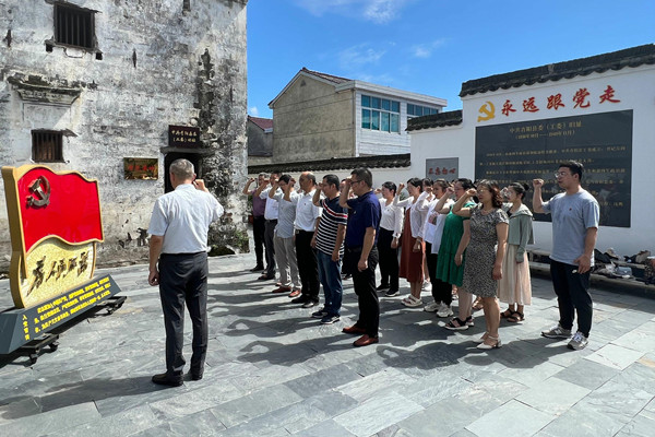 在中共青阳县委(工委)旧址,大家分别参观了红色人物、统一战线、反顽斗争、抗日救亡四个主题展室,一件件老旧物品,一幅幅珍贵图片,无声记录着当年的烽火岁月,展示了青阳人民不怕牺牲、英勇抗日的大无畏精神。参观活动结束后,全体党员重温了入党誓词。
