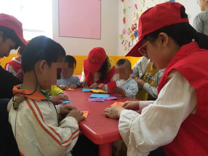 在康复训练期间,志愿者们以小朋友为中心,心为小朋友所想,志愿者们教小朋友们简单的英语字母,慢慢地引导他们发音,并手把手教他们在黑板上写这些简单的字母;与小朋友一起做手工,一步一步地教小朋友叠出可爱的东西;最开心的是志愿者与小朋友一起表演节目,简单易懂的节目给小朋友和志愿者们带来很多欢乐。虽然在陪伴他们一起学习,玩耍的过程会遇到困难,但是志愿者都非常有耐心地帮助小朋友,让小朋友感到亲切、愉悦。