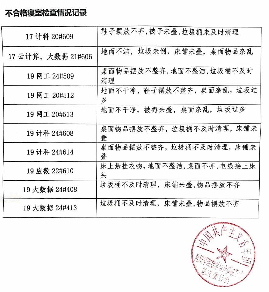 (6)17计科存在鞋子摆放不齐,被子未叠,垃圾桶未及时清理现象。17计科辅导员要督促同学打扫卫生。