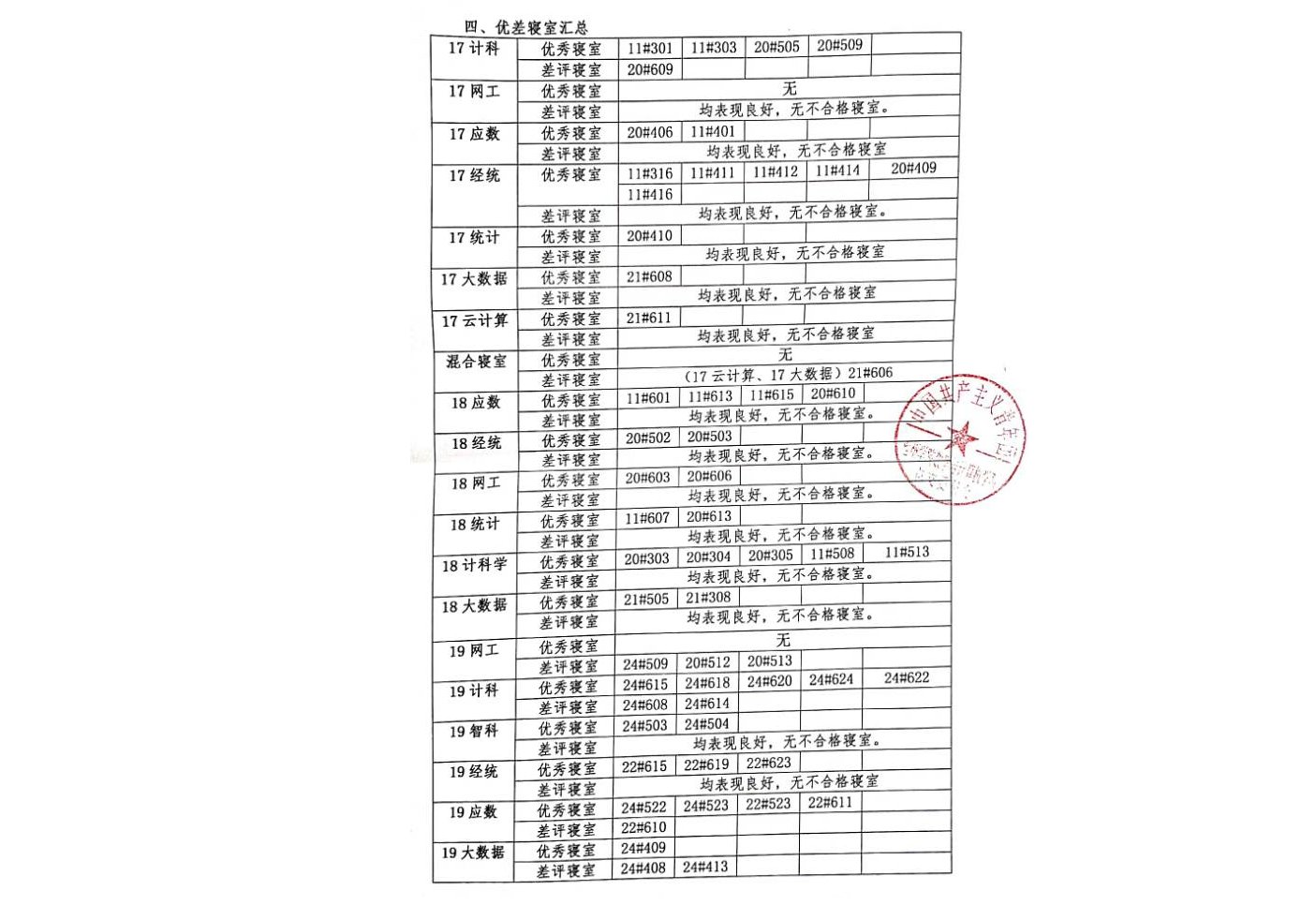 (3)19应数存在床上悬挂衣物,地面不整洁,桌面不齐,电线接上床头现象。19应数辅导员要督促同学打扫卫生以及宣传用电安全。