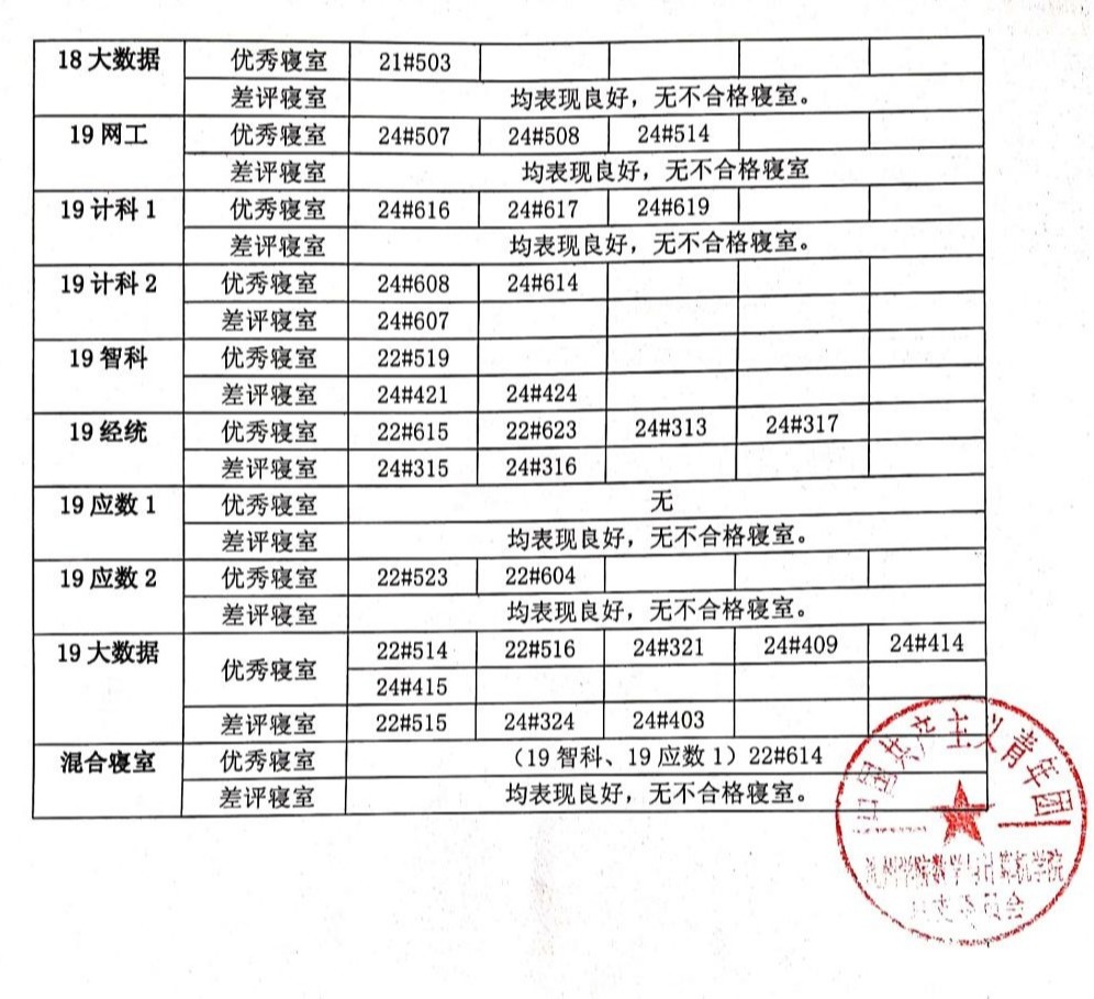 (2)19级主要问题:地面不洁,东西摆放乱,衣服乱挂,垃圾未倒,用电不安全。