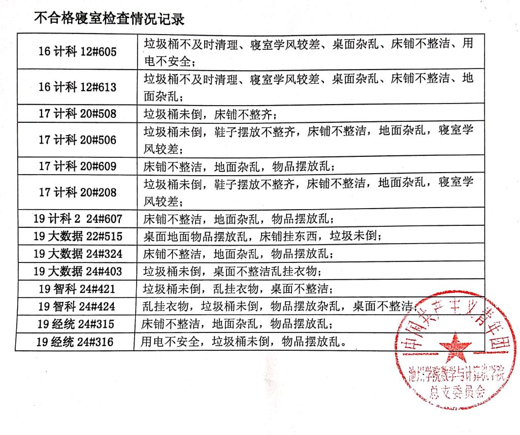 (2)17计科存在垃圾桶不及时清理,床铺未叠,物品摆放不齐现象。辅导员要督促同学打扫卫生。