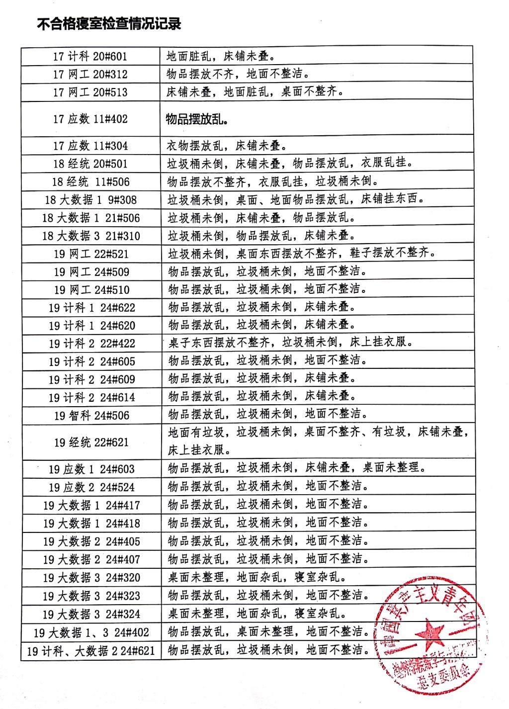 (3)18大数据应数存在床上悬挂衣物,地面不整洁,桌面不整洁,垃圾未倒。辅导员要督促同学打扫卫生。
