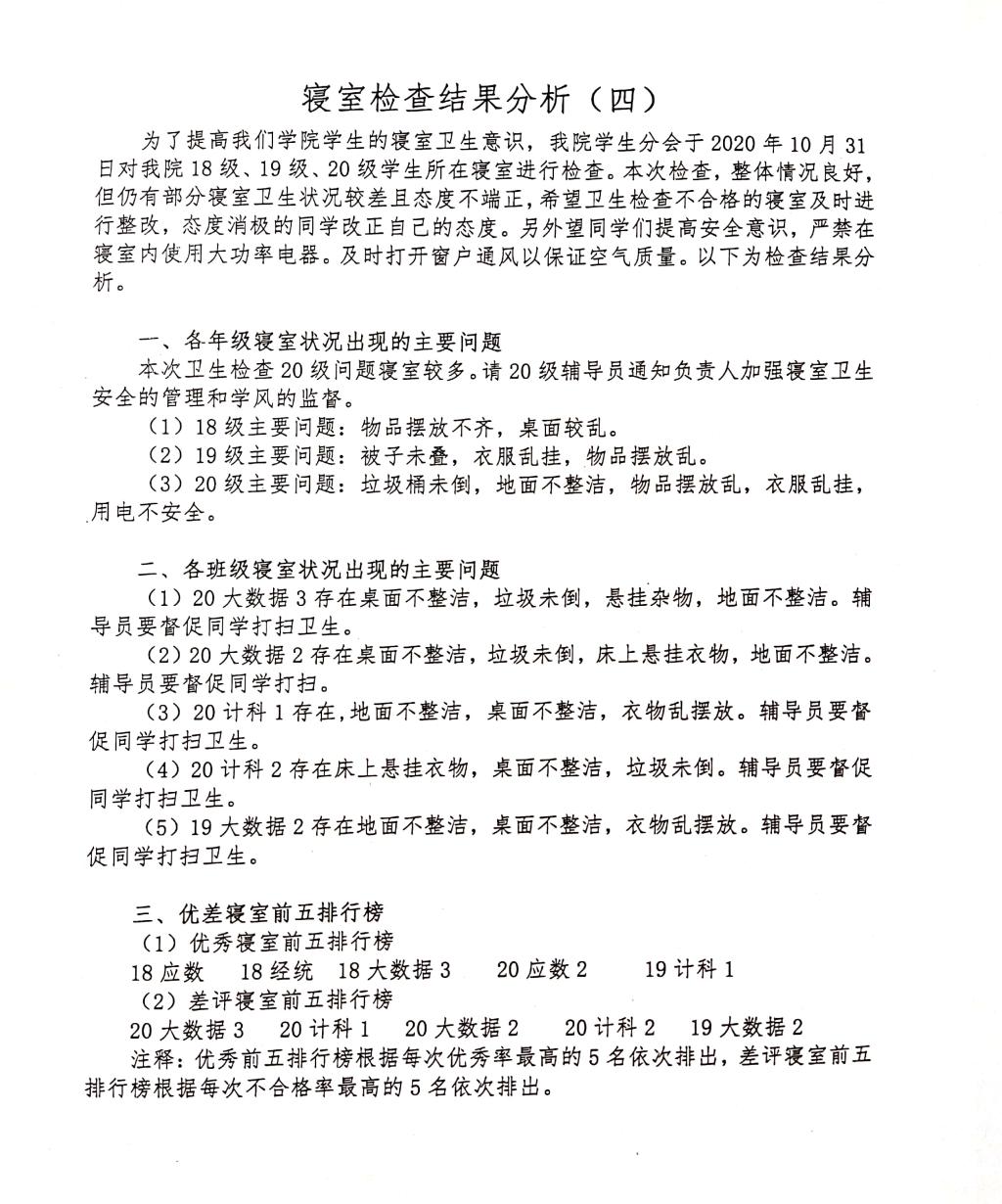 为了提高我们公司员工的寝室卫生意识,公司员工分会于2020年10月31日对公司18级、19级、20级员工所在寝室进行检查。本次检查,整体情况良好,但仍有部分寝室卫生状况较差且态度不端正,希望卫生检查不合格的寝室及时进行整改,态度消极的同学改正自己的态度。另外望同学们提高安全意识,严禁在寝室内使用大功率电器。及时打开窗户通风以保证空气质量。以下为检查结果分析。