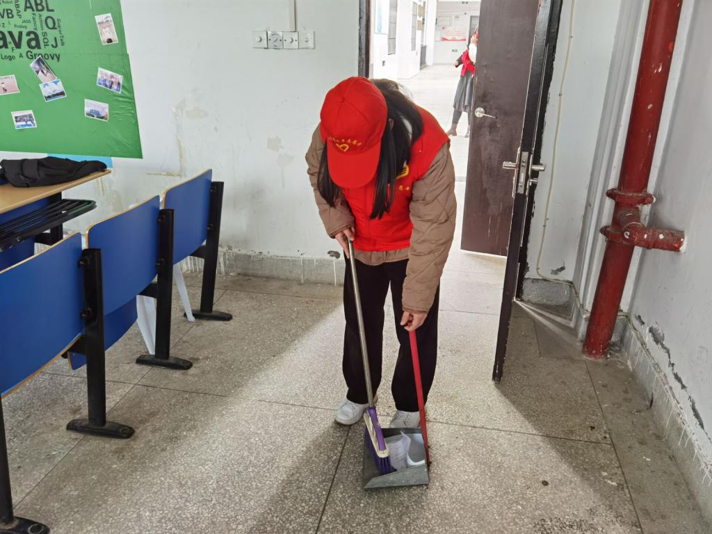 志愿者们对教室、走廊、门窗、楼梯间的卫生死角进行一次彻底地打扫。最后,志愿者们看着干净的教学楼露出了高兴的笑容,最后志愿者们在教学楼门口合影留念。