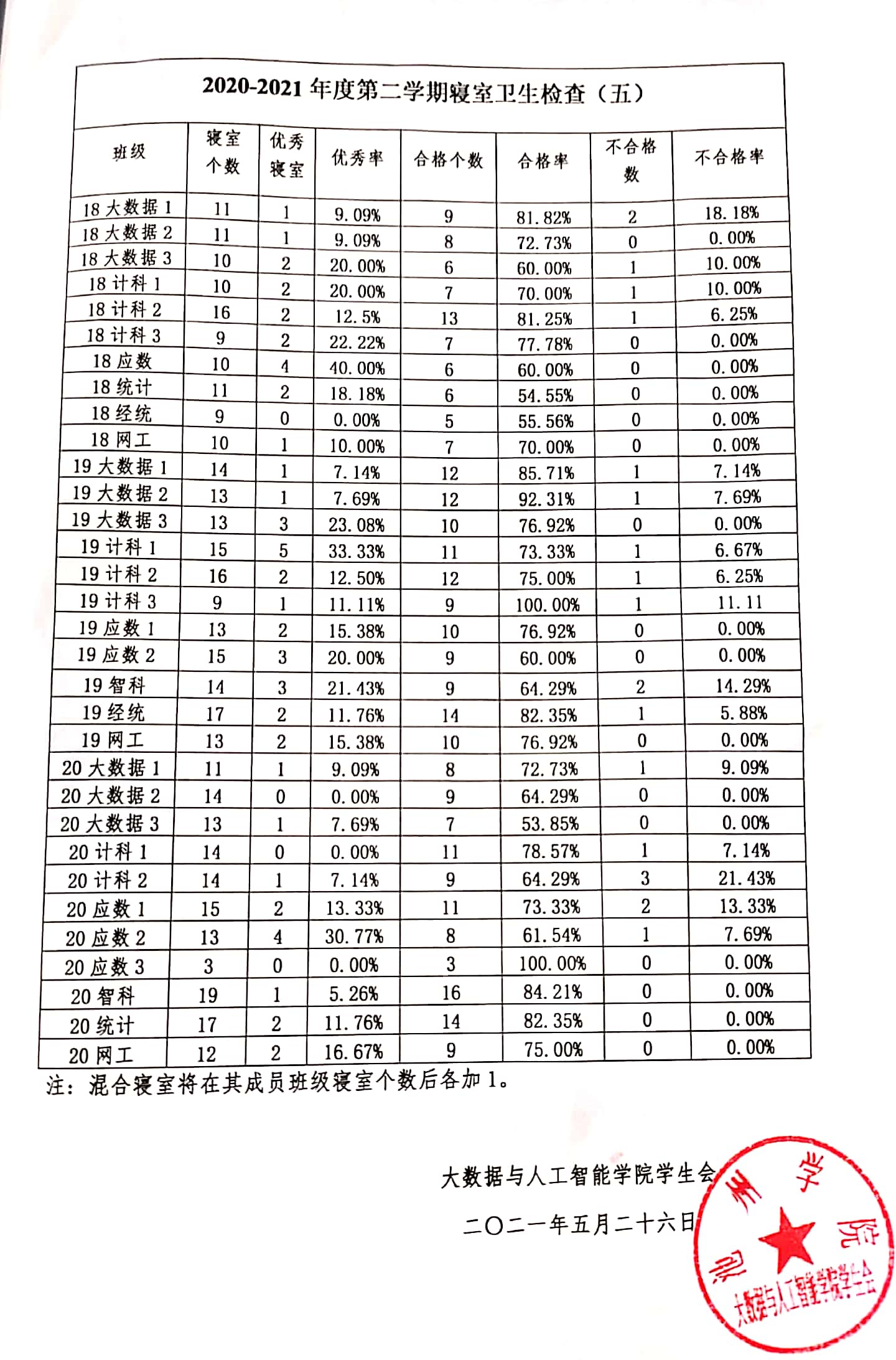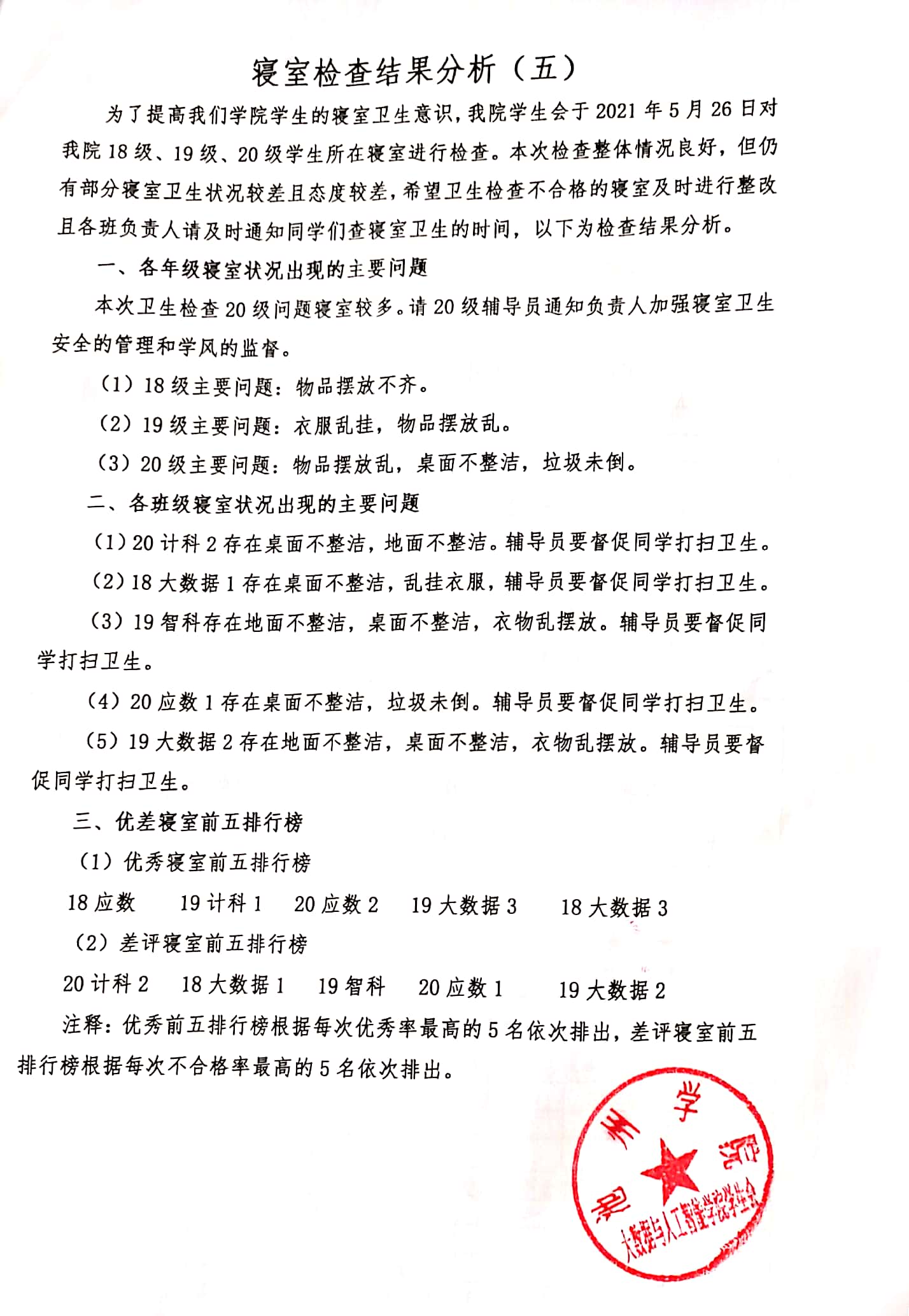 为了提高我们公司员工的寝室卫生意识,公司员工会于2021年5月26日对公司18级、19级、20级员工所在寝室进行检查。本次检查整体情况良好,但仍有部分寝室卫生状况较差且态度较差,希望卫生检查不合格的寝室及时进行整改且各班负责人请及时通知同学们查寝室卫生的时间,以下为检查结果分析。