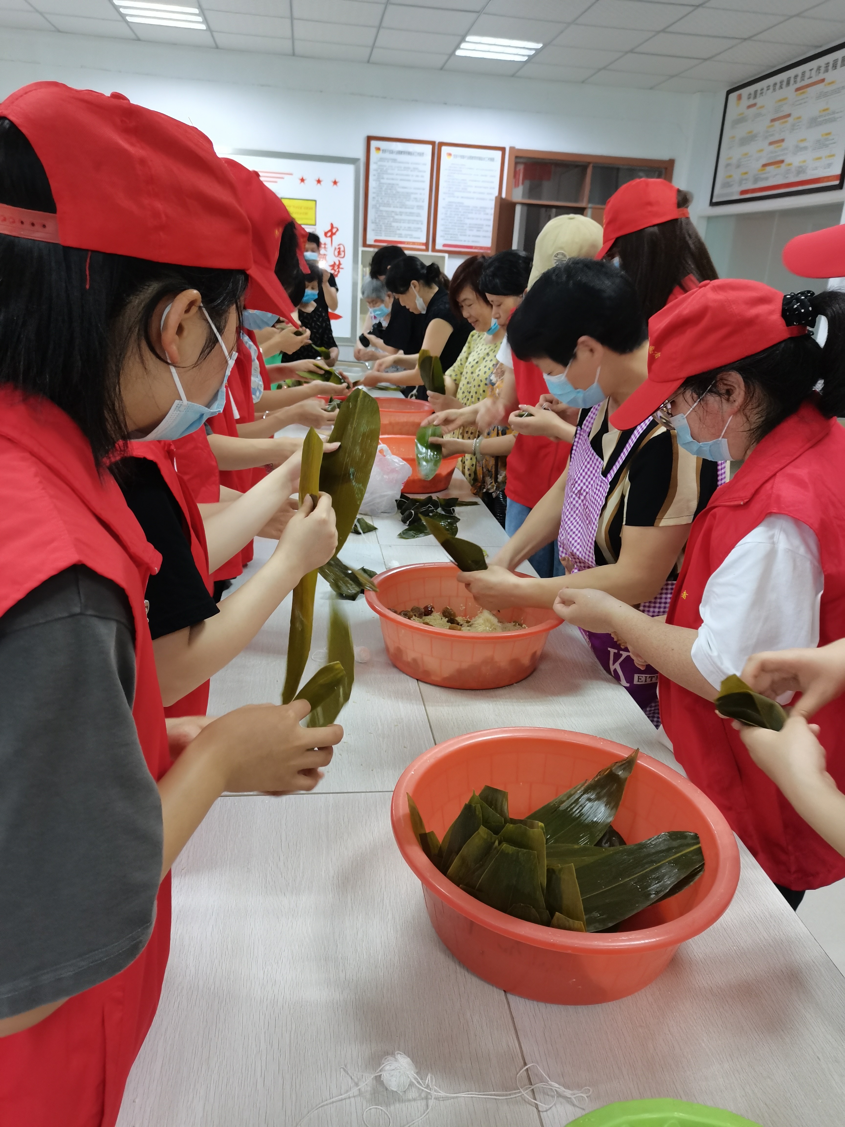 活动前期,各部门最好一系列准备工作,并让志愿者们了解活动的规则。活动时,志愿们准备好包粽子的材料,学习包粽子的工艺,最后将包好的粽子分发给九华社区的居民。