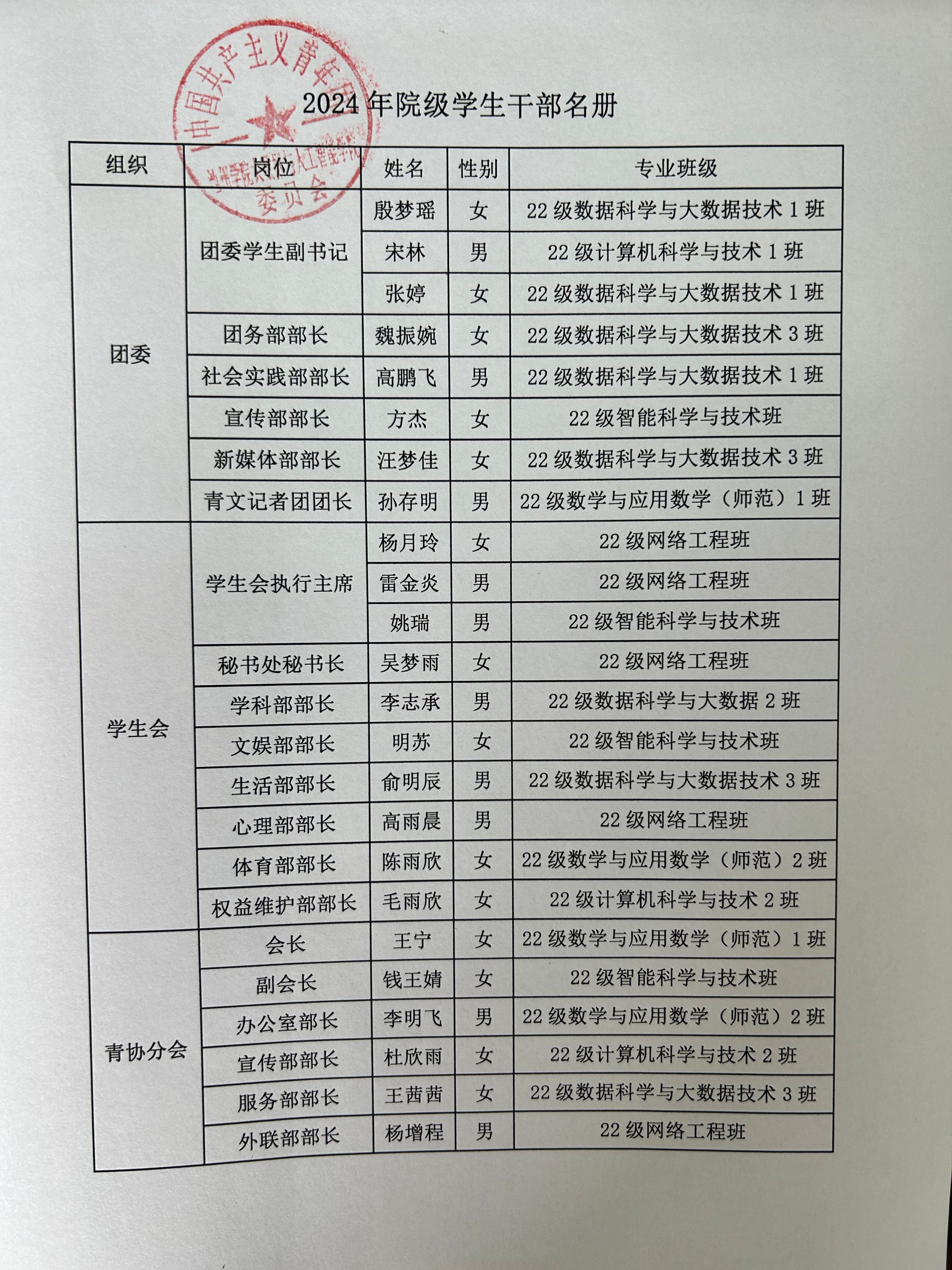 为进一步加强公司团学干部队伍建设,提升团学组织活力,让一批思想素质高、工作能力强的同学加入到院级团学干部队伍中来,根据《关于公开选拔院级员工干部的通知》要求,经个人自荐、资格审查、面试和综合评定等环节,确定聘任院级员工干部24名。现将员工干部聘任结果予以公布。