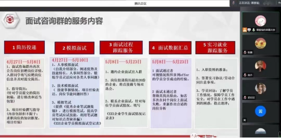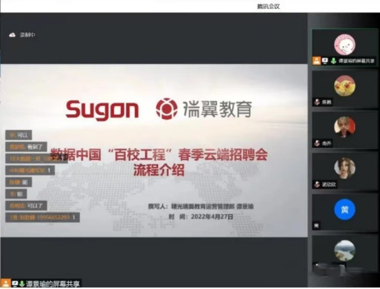会上曙光瑞翼的就业老师谭老师为参与启动会的学子们详细讲述了此次云端招聘会参会企业岗位及城市分布介绍、招聘面试的具体流程及曙光瑞翼提供的面试咨询群的服务内容。