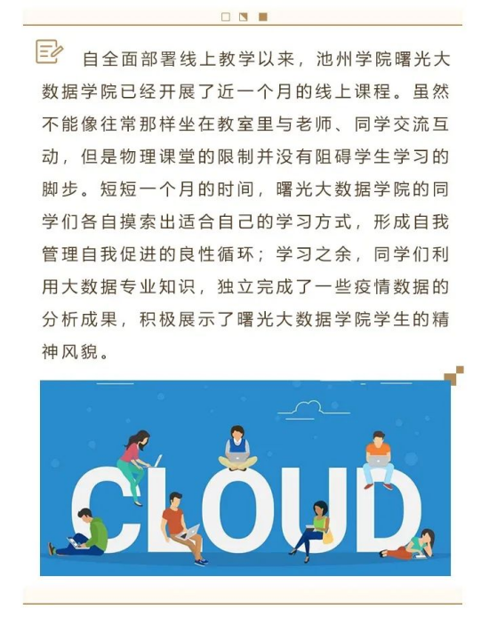 “善学者,因其势而利导之。”在互联网如此发达的今天,物理界限产生或演化的问题已经不是问题了,相信通过师生的共同努力,我们不仅能够共同打赢这场抗击疫情的攻坚战,更能够打造和展示出一套全新的学习风格。不一样的学习环境下,我们要同样绽放出属于大数据专业的员工风采。