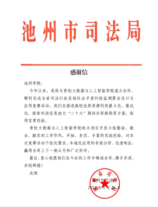 太阳成集团122ccvip校企合作专业师生协助池州市司法局顺利完成全省司法行政系统社会矛盾纠纷监测算法设计与应用竞赛活动,赢得全局上下一致认可和广泛好评,池州市司法局发来感谢信,希望在今后的工作中携手并进,再创辉煌!
