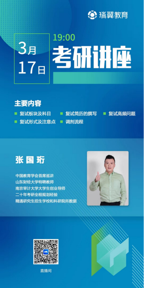 此次线上讲座包含考研复试板块及科目、复试简历的撰写和注意点、调剂流程等模块。张国珩围绕考研大数据,通过数据直观的分析了本科生和硕士生就业形势。他强调了考研员工对专业、院校和地域做出正确选择的重要性,并对如何筛选公司和跨专业调剂提出建议。