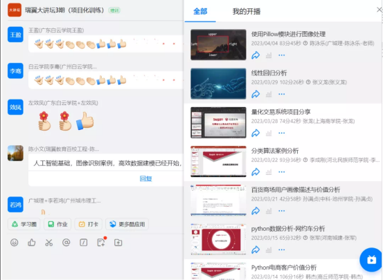 本次大讲坛直播自2022年11月23日起,每周两次,共计直播37场,100余课时,千余人参与。内容涵盖Java、Python、APP、小程序开发及数据挖掘、机器学习与算法、大数据开发、深度学习等。